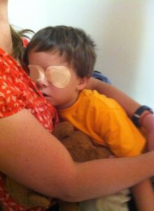 In 2011, doctors diagnosed Creed with LCA; in the months following he received a genetic diagnosis of LCA-RPE65. Image: Toddler-aged Creed wearing patches over both eyes.