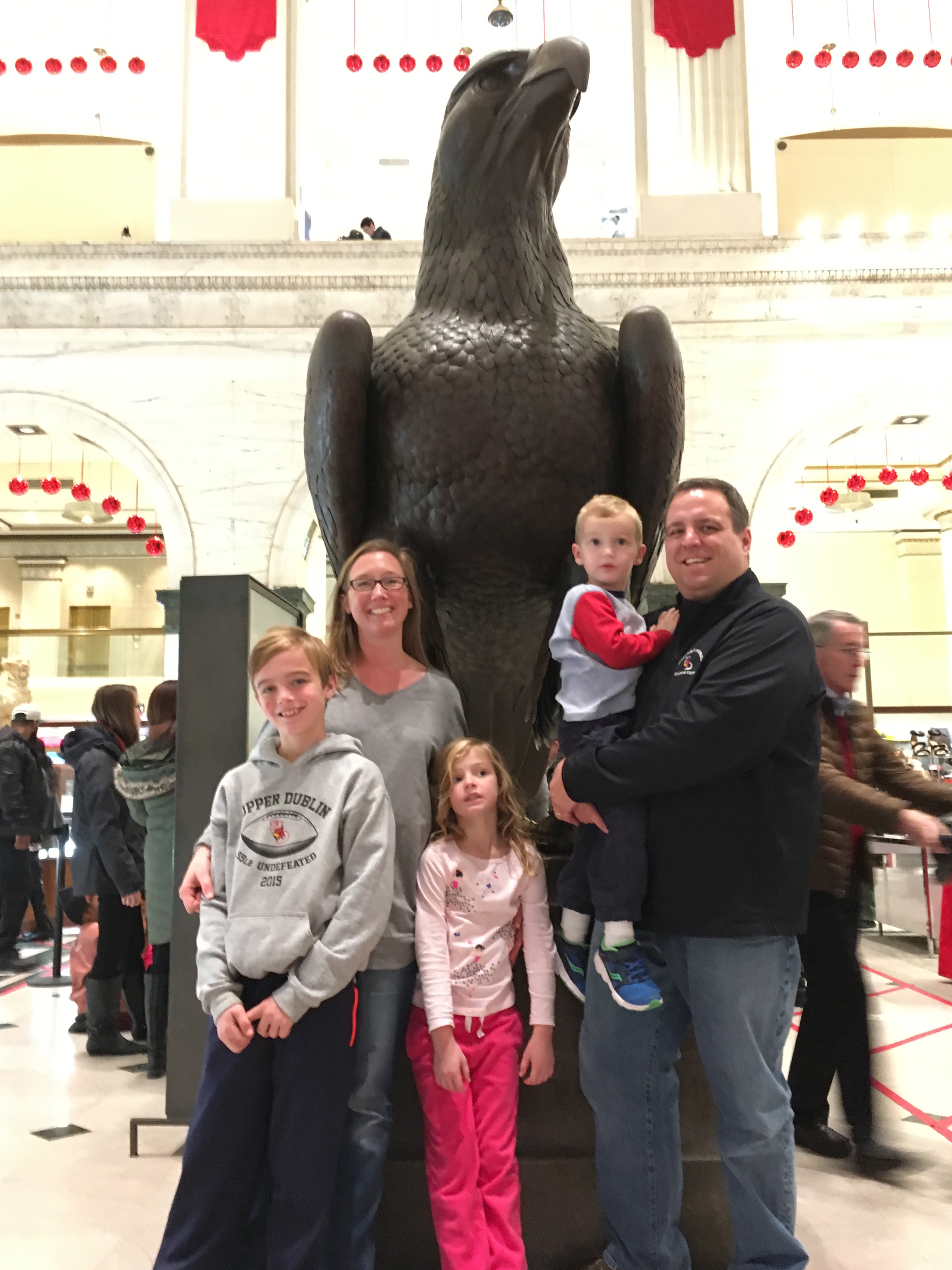 Pictured: Hannah, center, with her mom Amy, dad Christopher and brothers Jacob and Matthew, standing in front of a giant bald eagle statue.