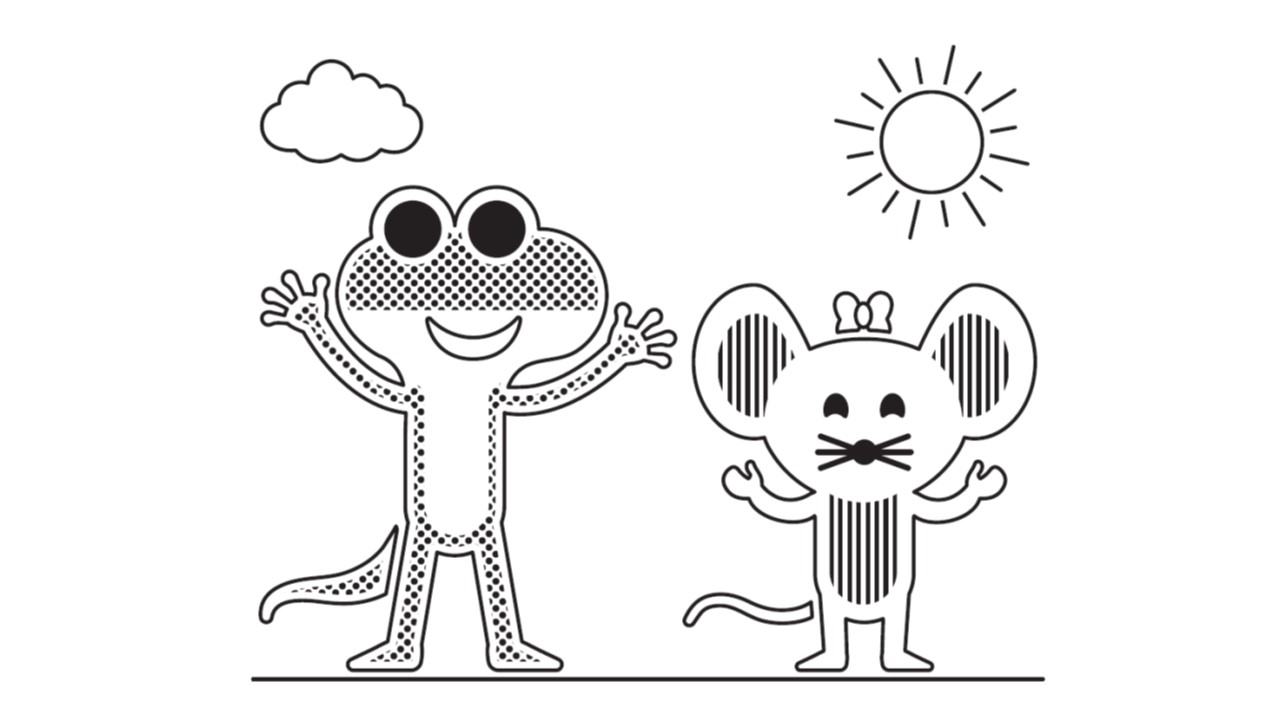 Black and white cartoon drawings of a lizard and a mouseWith songs in Dutch, English, French and German, the songbook’s characters, Lux the lizard and Louise the mouse, help expose children with blindness or visual impairment to learning other languages from an early age and allow them to independently explore the world.